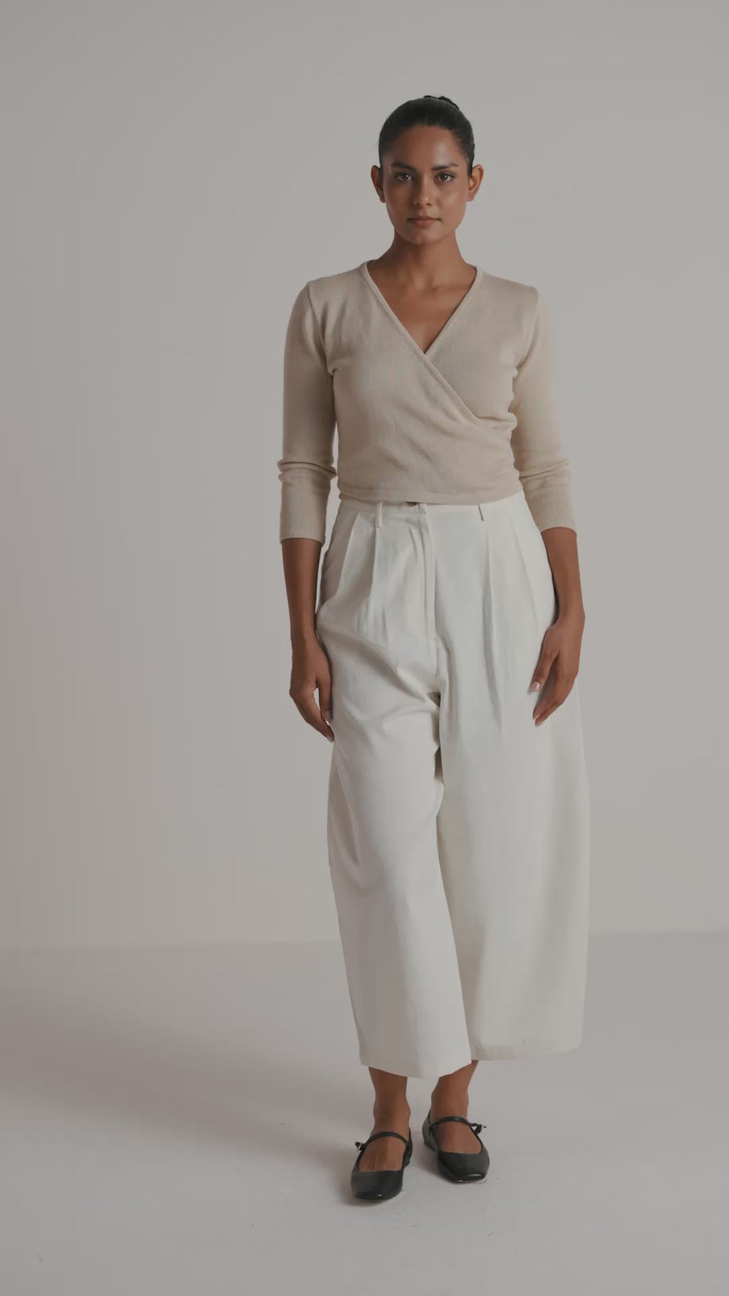 Elegant and effortless, the Ballet Wrap Top is crafted from a luxuriously soft blend of cotton and baby alpaca. Designed with a classic neckline, cropped body, and wraparound detail, it offers a flattering fit and timeless silhouette. Lightweight and cozy, it’s the perfect everyday top—easy to dress up or down and pairs beautifully with everything from high-rise trousers to skirts and denim.