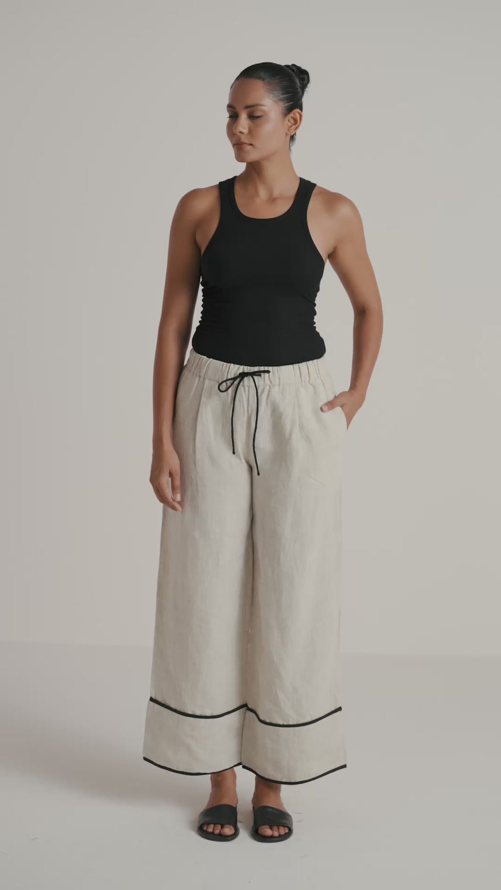 Relaxed and refined, the Easy Pant is crafted from a natural undyed organic cotton-linen blend, accented with modern black piping for a clean, elevated finish. Designed with a full-length silhouette, this pant features an elasticated waistband with a functional drawcord for a customizable fit, along with practical side pockets. Easy to wear and effortlessly stylish, it’s the perfect everyday pant to pair with coordinating tops or your favorite essentials.