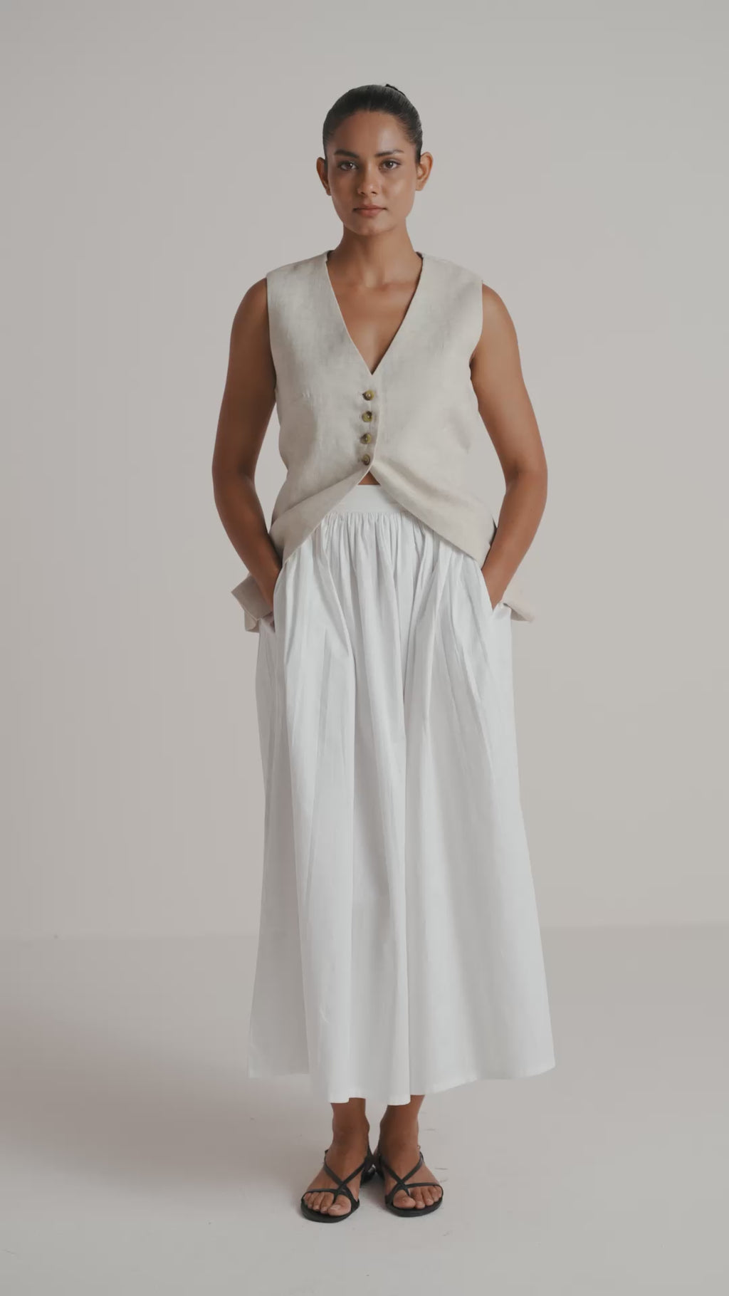 Sophisticated and sleek, the Longline Vest is crafted from an undyed natural organic cotton-linen blend. Featuring clean, modern lines and a deep V-neckline, this fitted vest is tailored to flatter. Tortoise shell buttons add a touch of refined detail, while the adjustable back ensures a perfect, customizable fit. A versatile piece, it’s ideal for elevating any outfit with understated elegance.