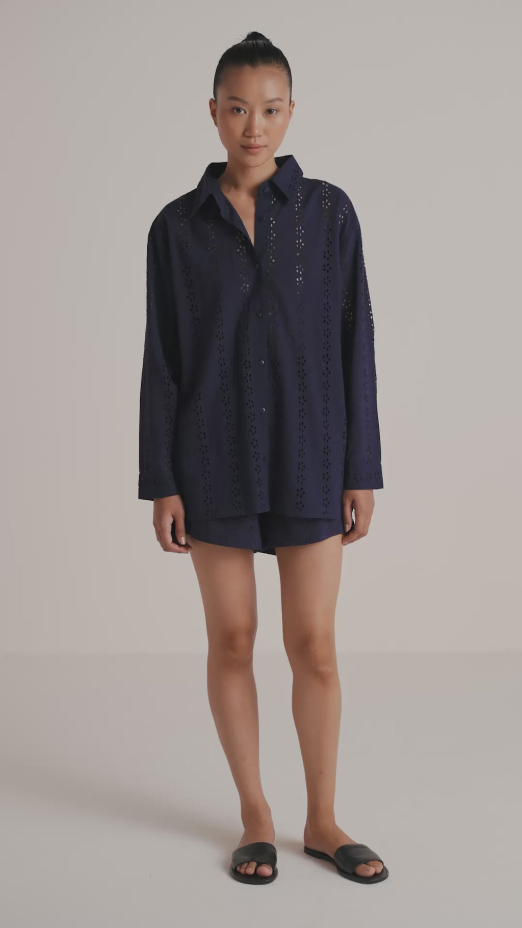Meet the shirt that does it all. The Everything Shirt is crafted from our organic cotton in intricate navy lace cutwork—lightweight, breathable, and effortlessly elegant. With a relaxed fit, long sleeves, and a classic button-up front, it’s designed for everyday wear with elevated ease. Style it open over a tank or buttoned up with the matching Easy Short for a coordinated look that transitions from lounge to out-and-about with ease.