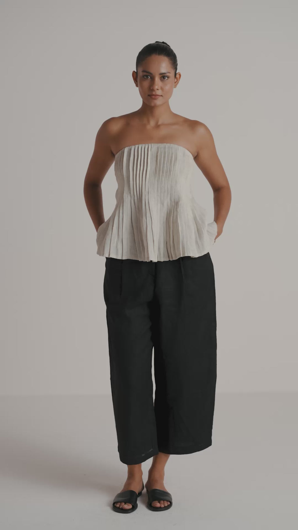 Make a statement in the Strapless Pleated Top, crafted from an undyed natural organic cotton-linen blend. Featuring a sleek strapless neckline and dramatic front pleats, this mid-length top combines bold design with refined tailoring. Finished with a gold back zipper for a flawless fit, it’s the perfect piece to elevate any outfit with effortless sophistication.